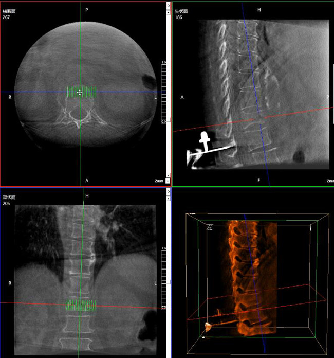 使用普爱医疗三维C形臂对患者进行胸椎影像扫描及三维重建,图像被同步传输到普爱医疗骨科机器人导航系统。